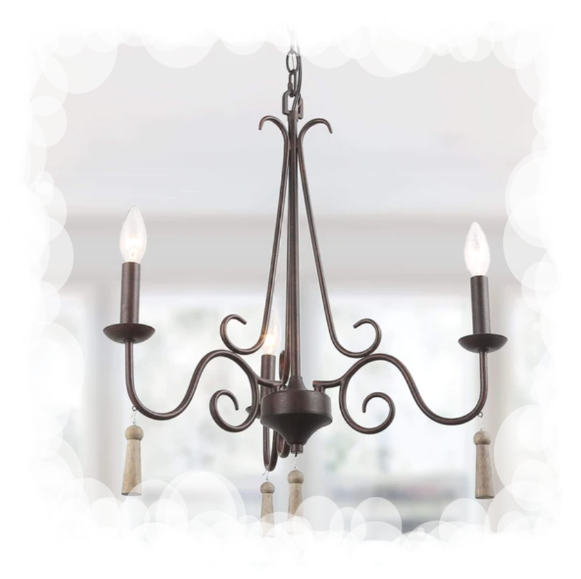 The bold matching of rustic metal is a unique yet fantastic fortuitous encounter. Exquisite subtle embossed wooden droplets accents boast timeless beauty and elegance. When on, this chandelier will make an artistic statement in any home decor. Beautifully scrolling arms bloom to hold 3 candle-like lights atop for a magical, opulent glow. When lit, it turns any space into an enchanting, cozy oasis.