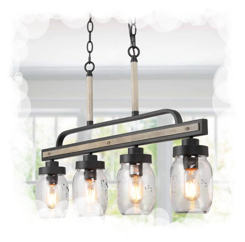 Simple linear island pendant lighting, especially designed to illuminate the heart of your kitchen, dining room or farm styled places. Crafted of metal in painting deep gray and rustic faux wood finish, this design features 4 clear Mason jars dropping down from the wood look linear base.